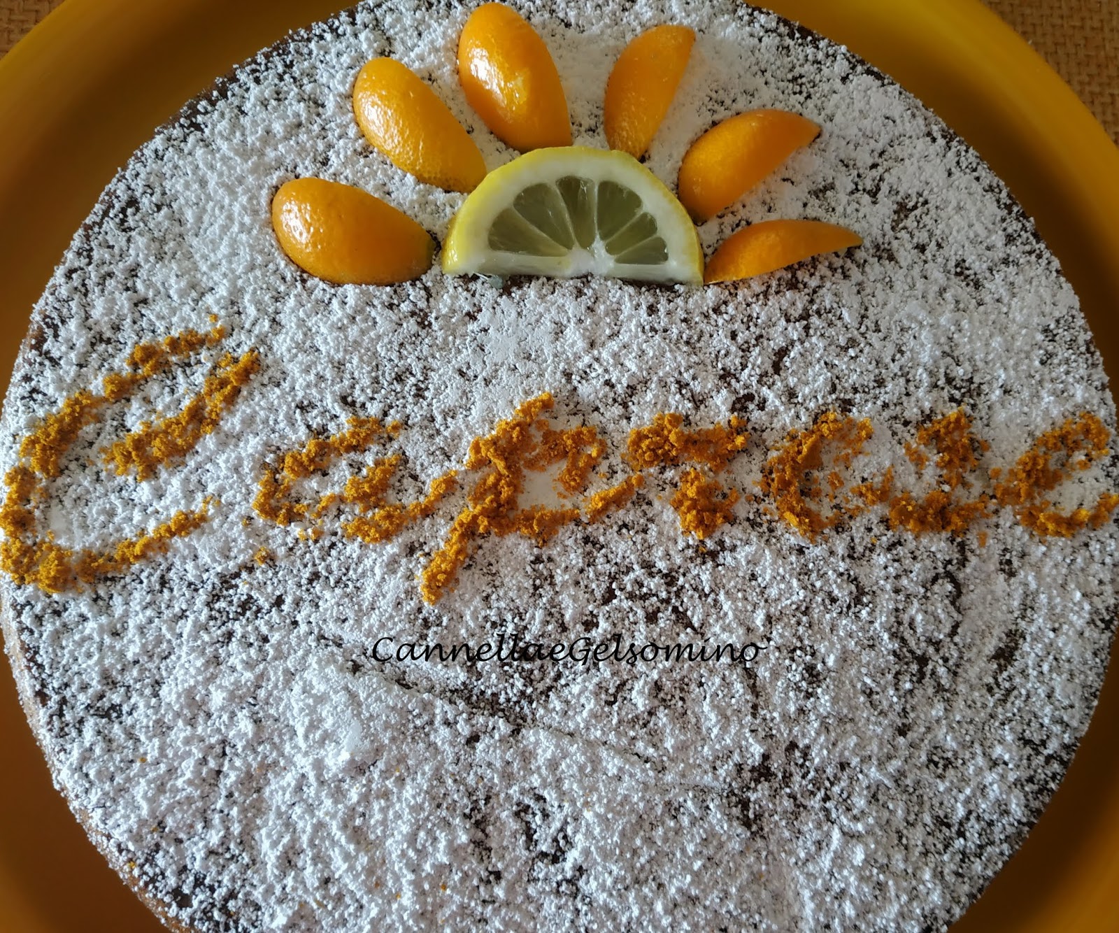Fate raffreddare e guarnite. Fatevi uno stencil con la classica scritta “Caprese” e dopo aver spolverizzato la torta di zucchero a velo, evidenziatela con cacao oppure, come ho fatto io, con polvere d’arancia. Potete guarnire con fette di limone o di altri agrumi ad esempio kumquat.