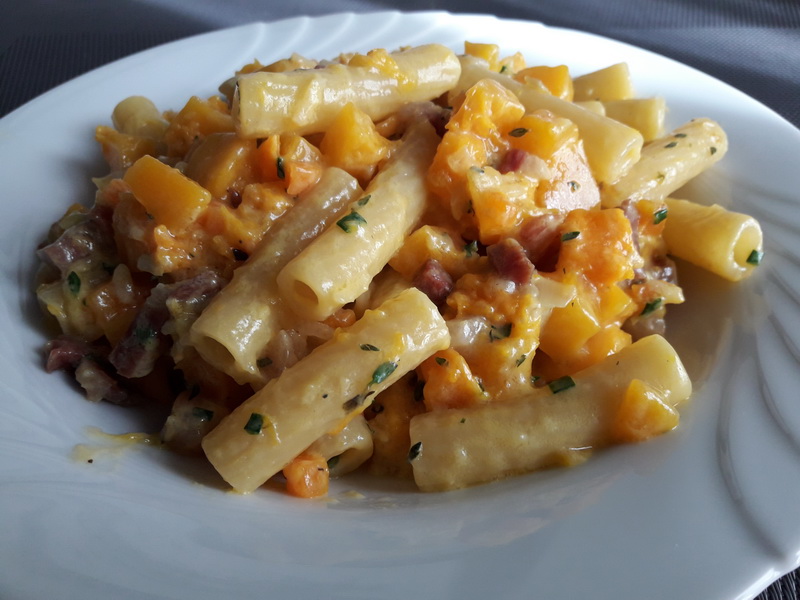 180 g di pasta corta, 250 gr di zucca già pulita, 50 g di pancetta dolce o affumicata, 1 tuorlo d’uovo, vino bianco, erba cipollina, timo fresco, uno scalogno, olio, sale, pepe.