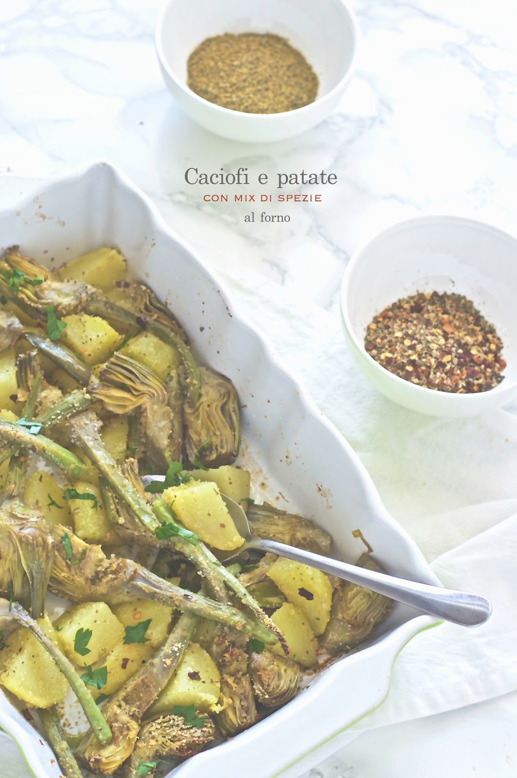 Di solito questo contorno lo preparo in padella dove le verdure rimangono più umide e cremose ma come ho detto anche precedentemente la prova costume mi aspetta e quindi ho voluto scegliere una cottura al forno ma non per questo meno buona e saporita, tutt’altro.