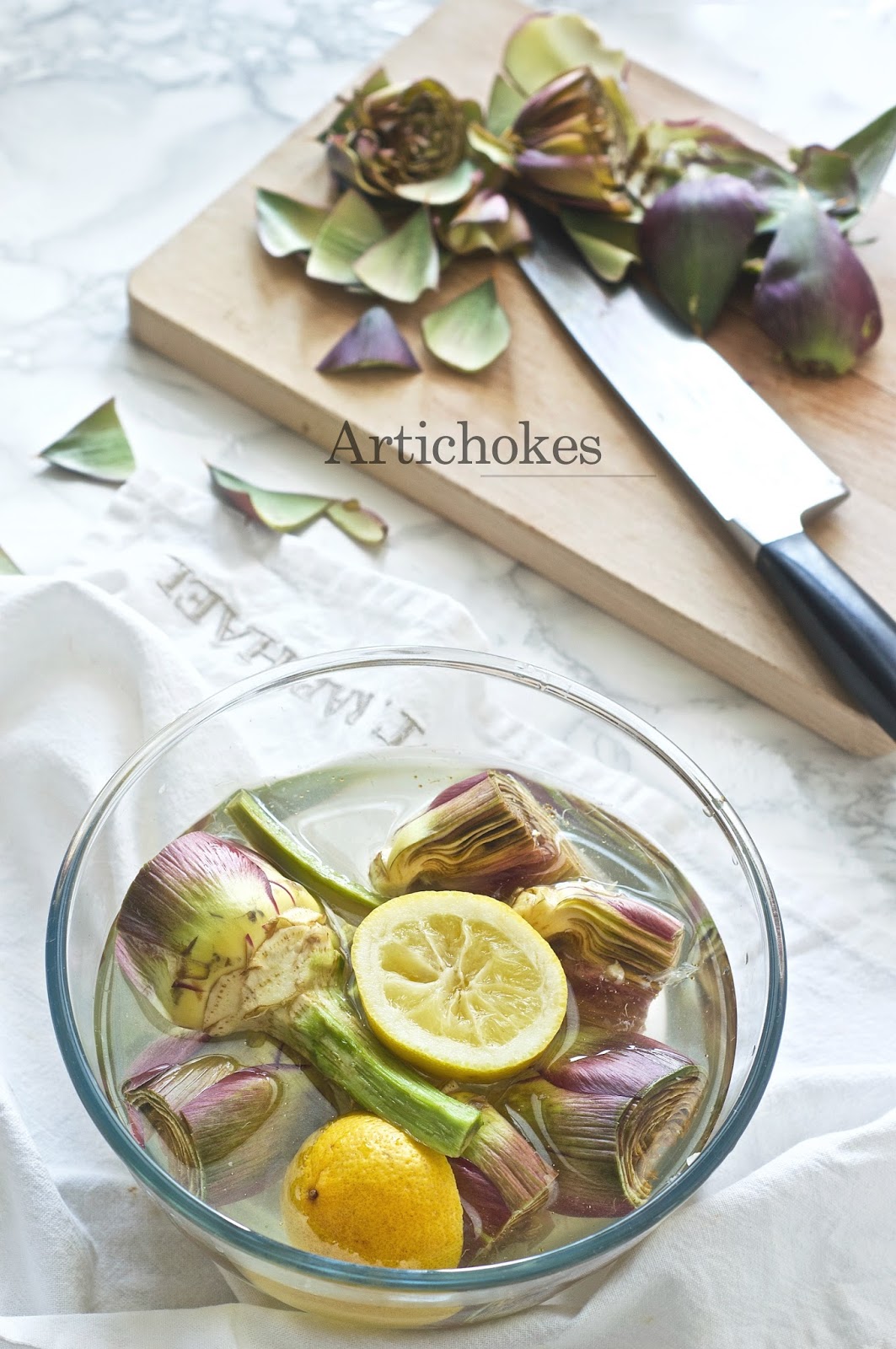 Lasciare a bagno per un oretta avendo cura di coprire con dei fogli di carta assorbente che avrete immerso nell’acqua e limone ( questo piccolo accorgimento serve per tenere umide le parti di carciofo che galleggiano in superficie e che rimarrebbero scoperte dall’acqua).