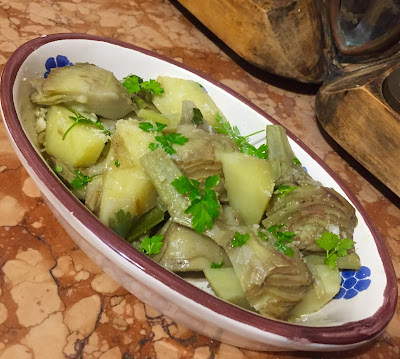Servite i carciofi e patate caldi, ma anche freddi sono squisiti.