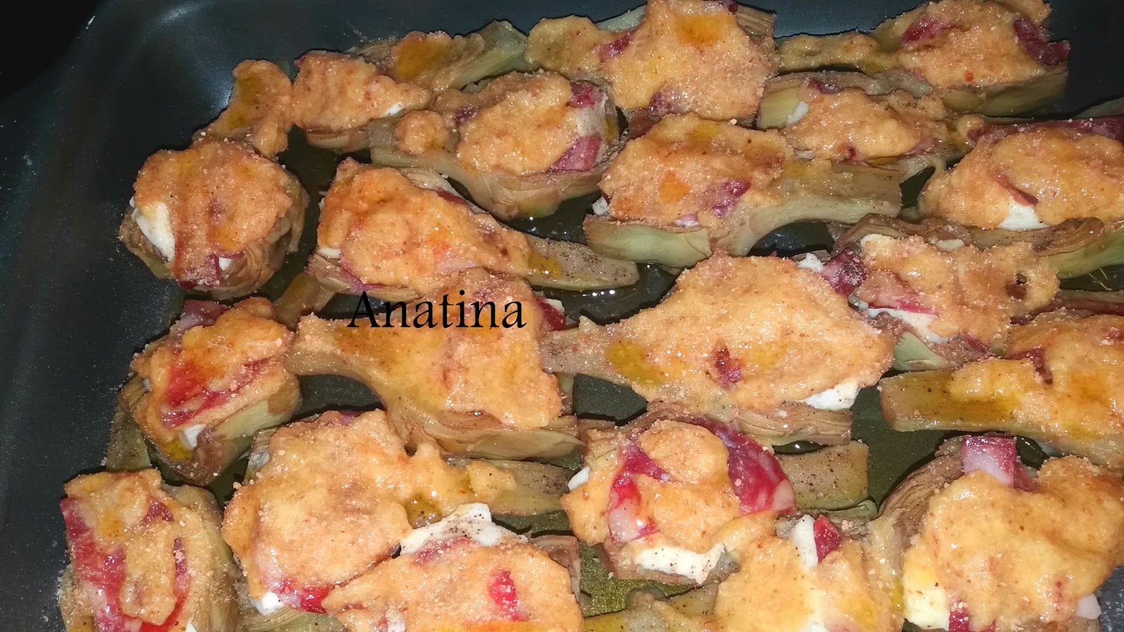 Poggiarli poi in una teglia con poco olio e farcire ogni mezzo carciofo con scamorza,salame