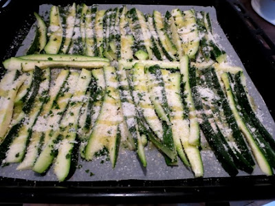 Mentre i carciofi stanno cuocendo lavare, spuntare le zucchine, tagliarle a bastoncini tutti delle stesse dimensioni…più o meno e disporli in un unico stato su un’altra teglia ricoperta da carata da forno..