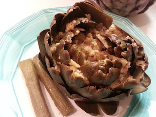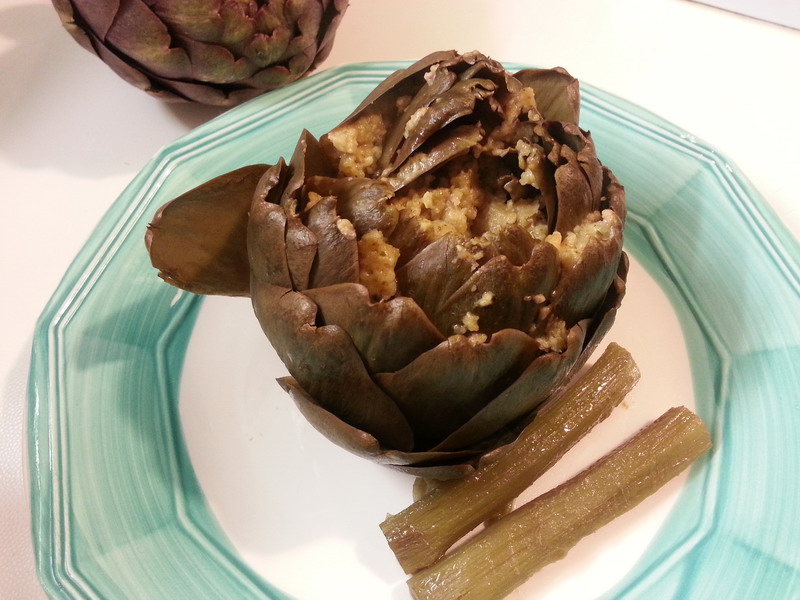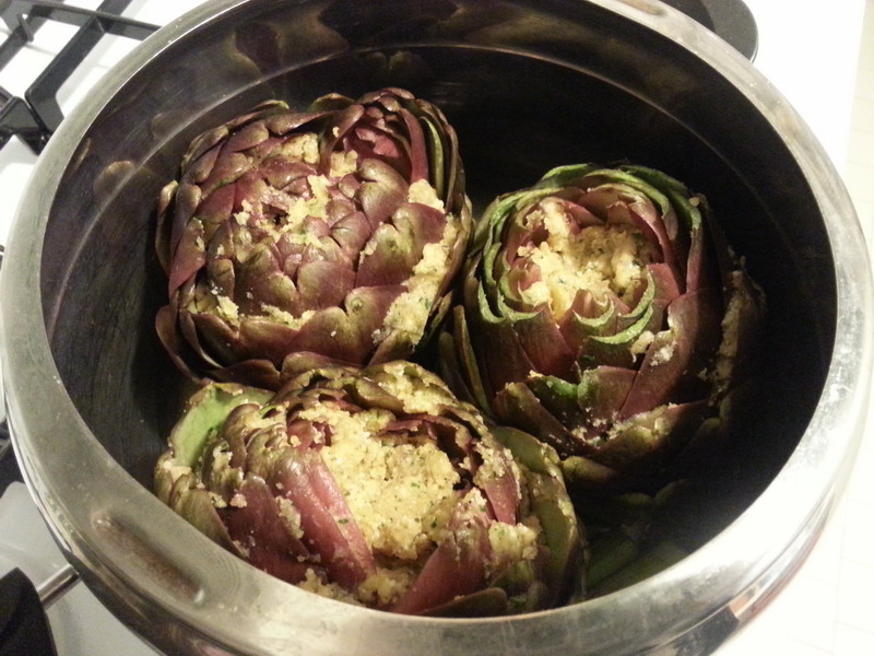 I carciofi così preparati possono costituire un leggero secondo piatto o un contorno: farciti con un impasto di pancetta affumicata, pecorino, uova, pangrattato e odori, cotti in pentola con olio e acqua, o in pentola a pressione come ho fatto io.
