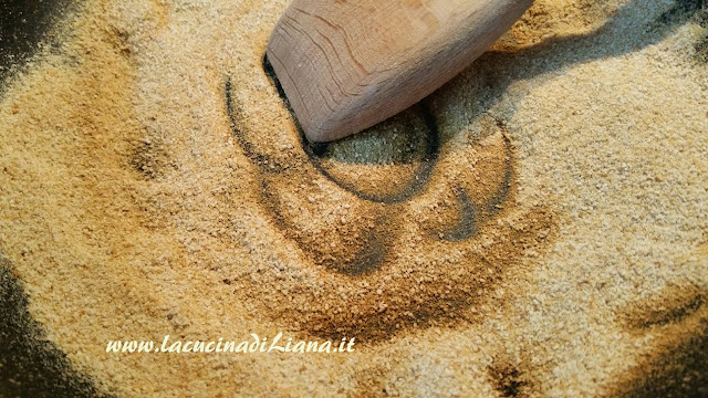 Fare tostare il pangrattato in una padella antiaderente a fuoco vivo girandolo con un cucchiaio di legno.