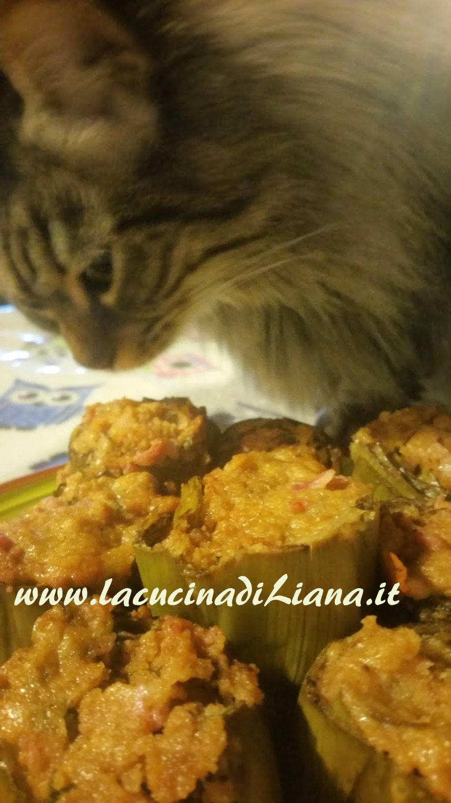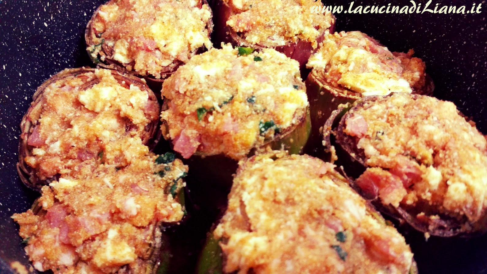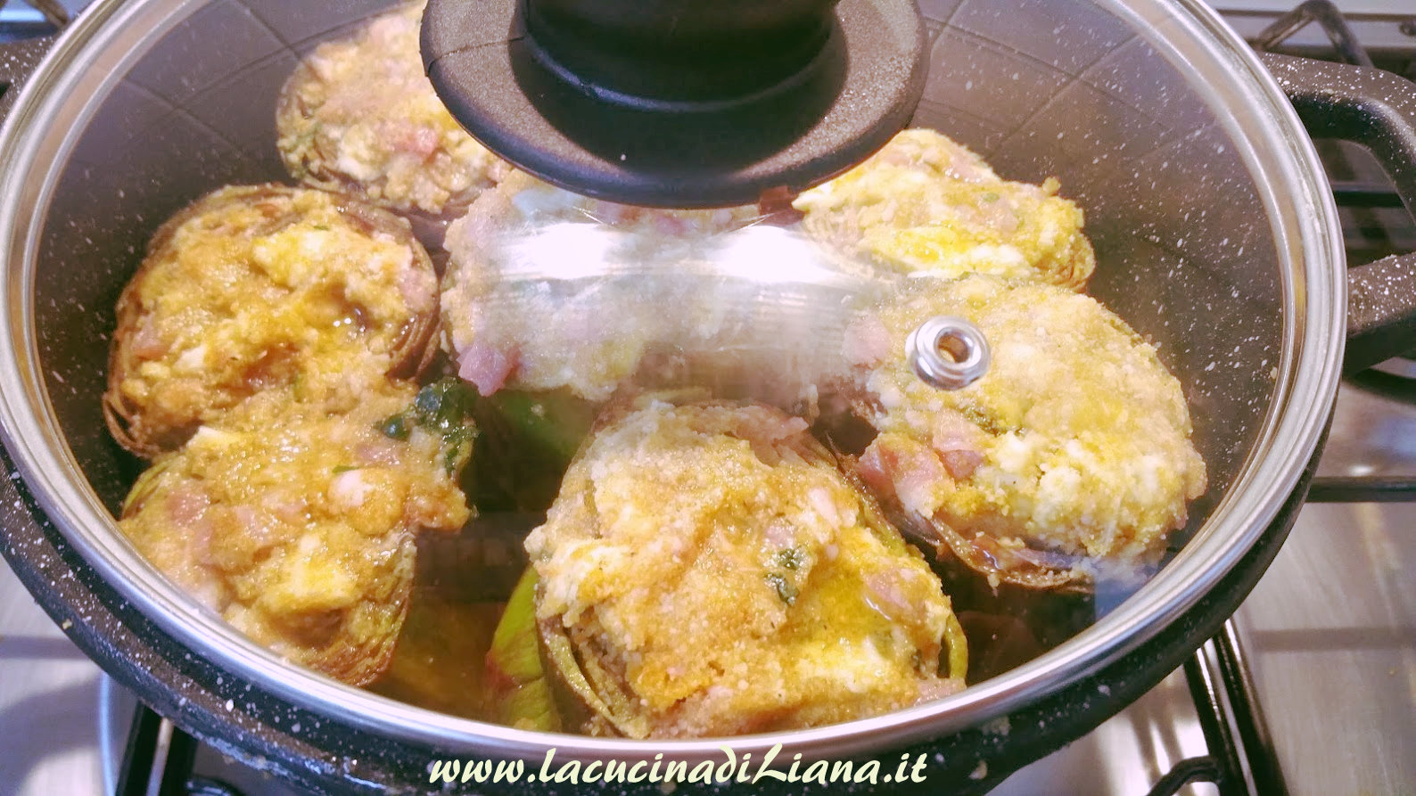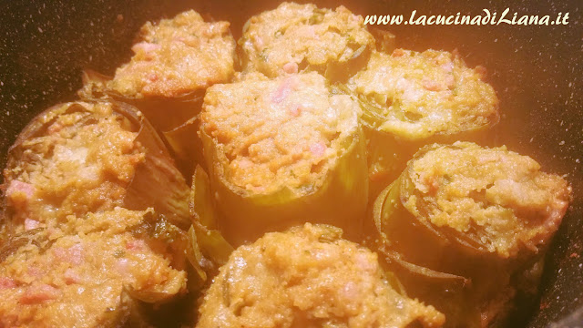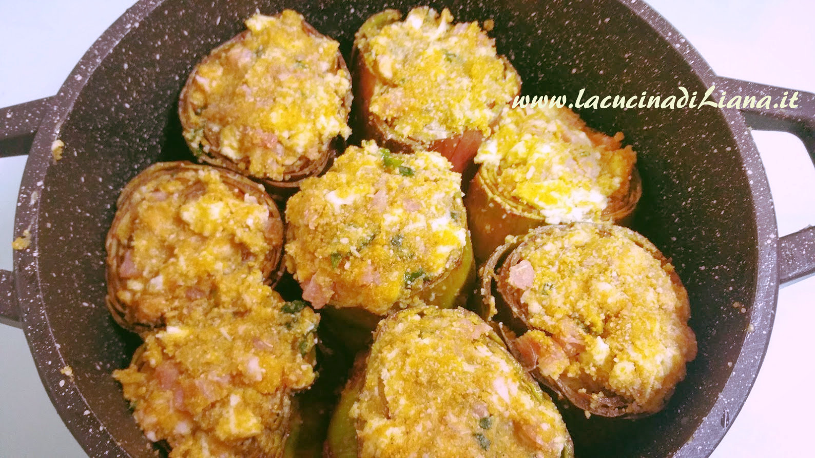 Sgocciolare i carciofi quindi allargare le foglie e farcirli con il ripieno formando una cupola.