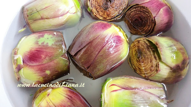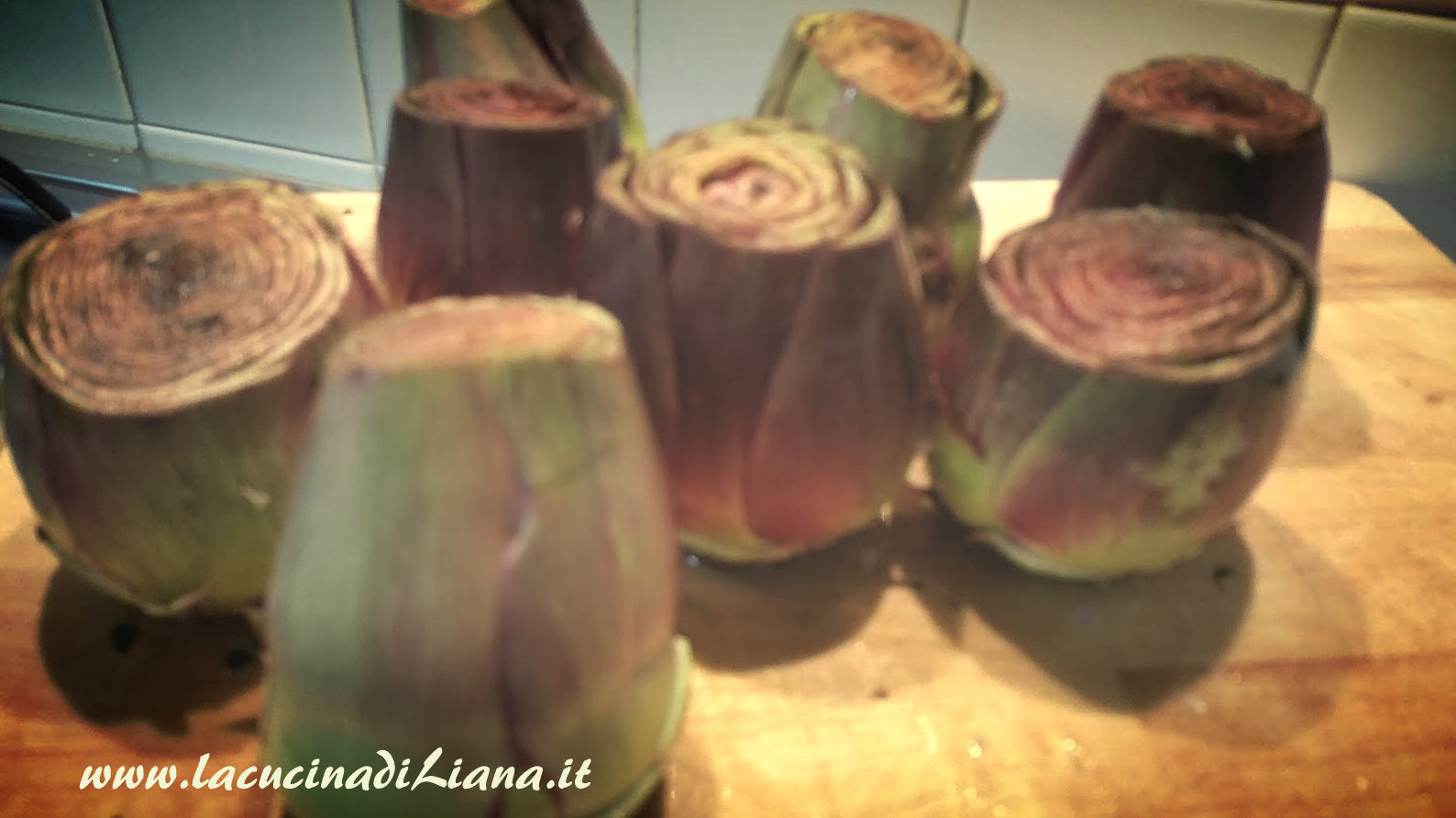 Lavare i carciofi, tagliarne la punta spinosa, ed eliminare le foglie esterne più dure, quindi tagliare il gambo alla base di ogni carciofo in modo che si mantengano dritti, ed immergerli in acqua e limone.