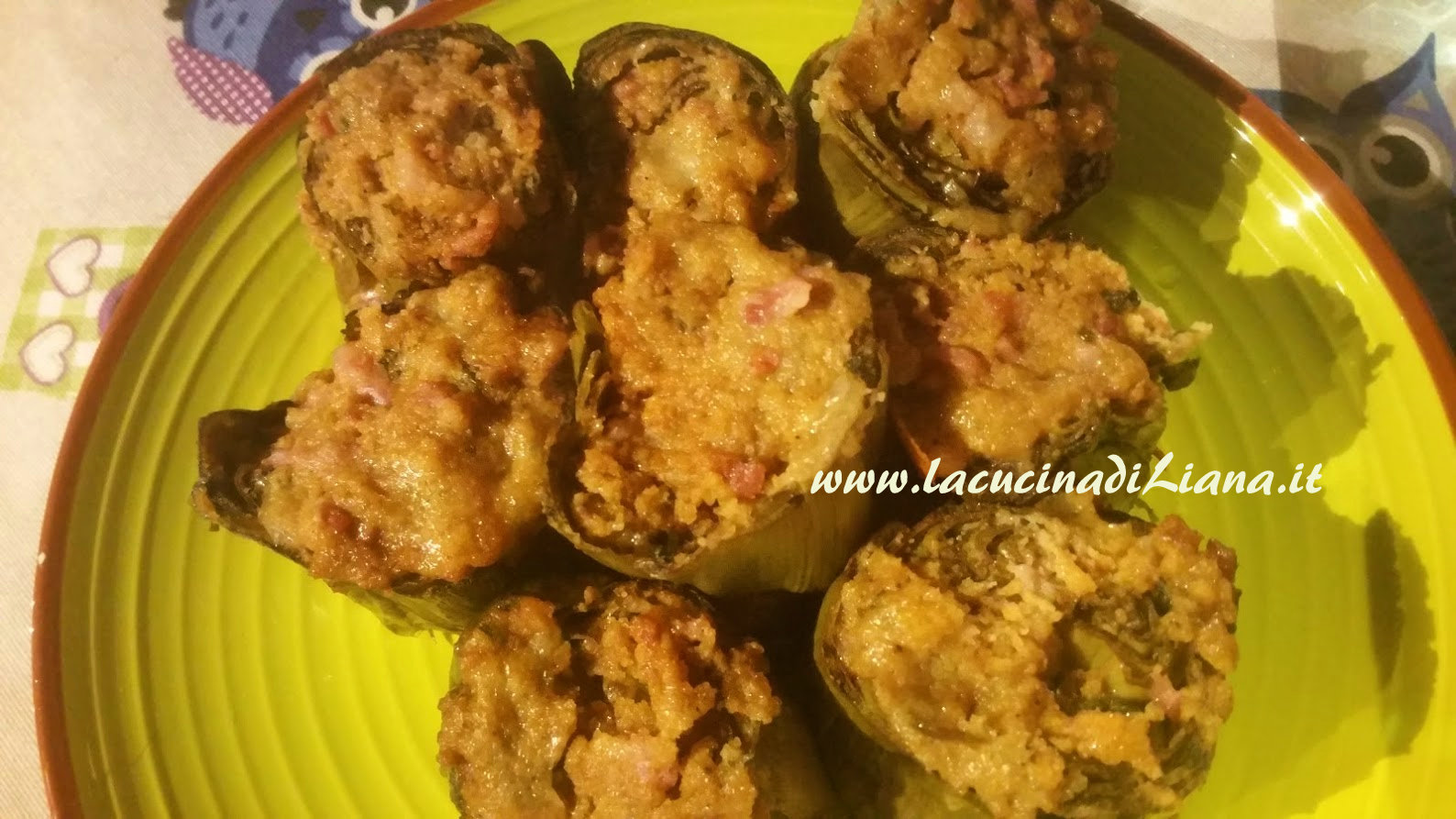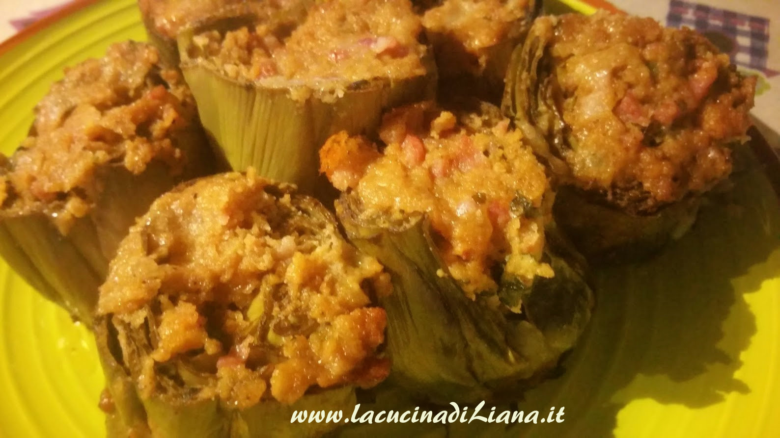 Questi carciofi ripieni, farciti con pancetta e mozzarella sono talmente buoni e saporiti da essere un ottimo pasto completo o un ricco contorno per una cena.