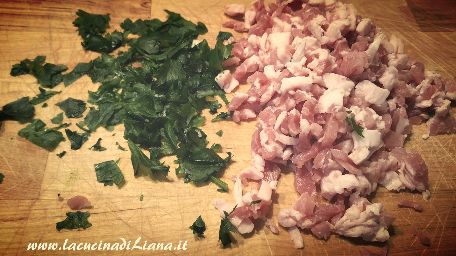 Tagliare a piccoli dadini la pancetta e la mozzarella.
