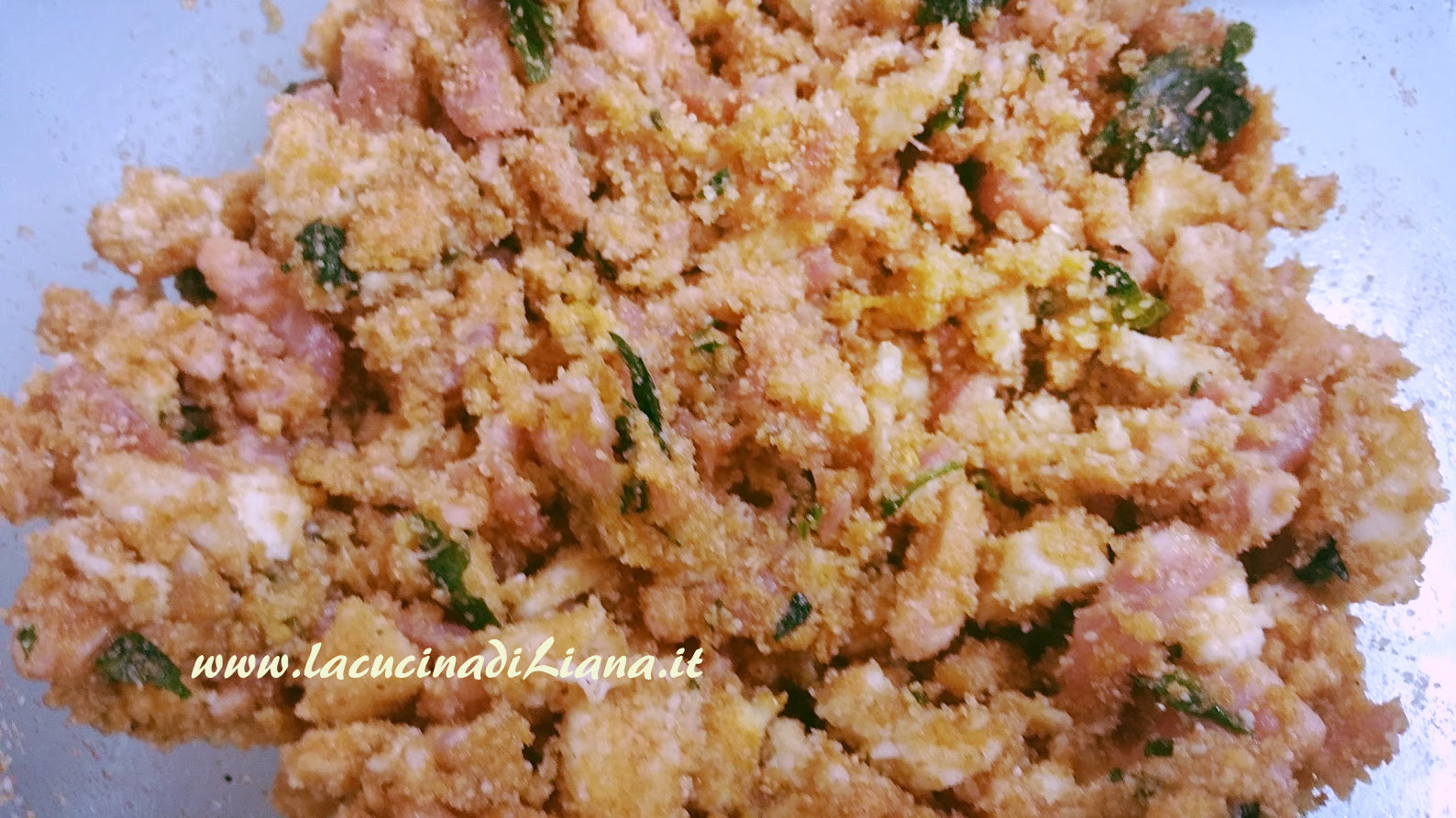 Mescolare il pangrattato tostato con un cucchiaio di prezzemolo tritato, il parmigiano, un tuorlo e la scorza grattugiata del limone; mescolare ed aggiungere la pancetta e la mozzarella, ed infine tanto olio quanto ne servirà per rendere il composto morbido. Regolare di sale e pepe.