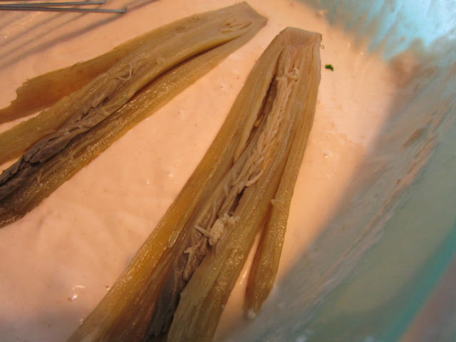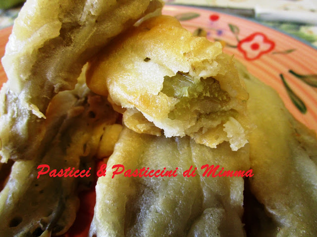 - tagliare a metà, per la lunghezza, i cardi, passarli nella pastella e friggerli in abbondante olio di semi