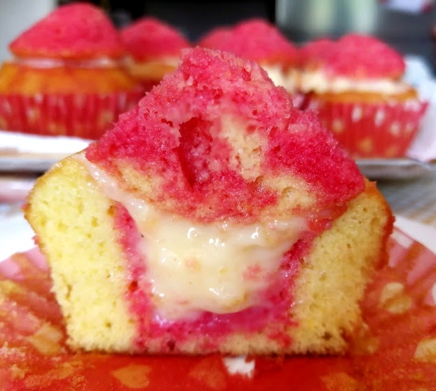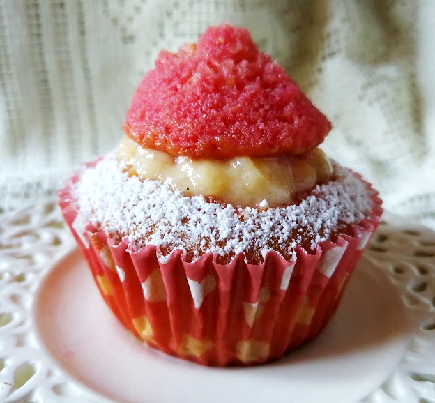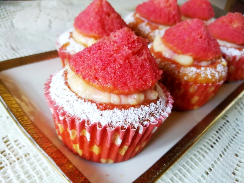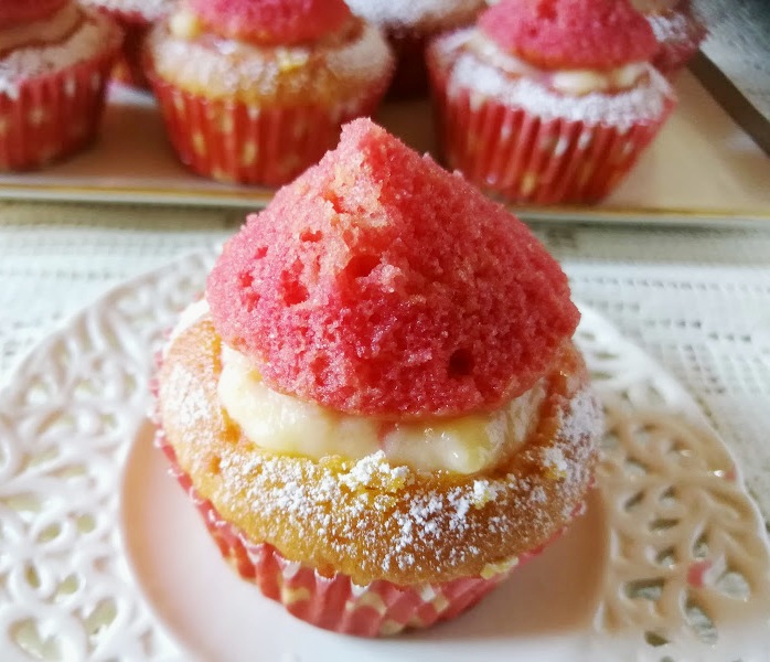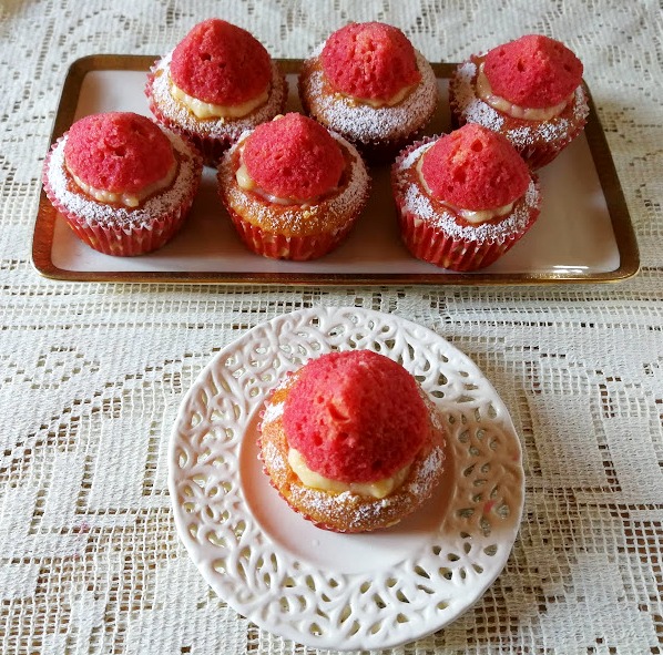 Pennellare l’interno dei muffin con l’Alkermes ( 3 bicchierini di liquore diluito con un bicchierino di acqua e con l’aggiunta di un cucchiaio scarso di zucchero).