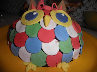 Con della pasta di zucchero o del cioccolato plastico (io ho usato quest’ultimo) ricavate tanti dischetti colorati, due triangoli per le orecchie, le zampette, il becco e un fiocchetto (io ho voluto fare una gufetta).