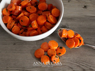 Lavare, pelare e privare le carote delle parti di scarto, tagliarle a rondelle e tuffarle in una pentola con acqua a bollore; cuocere per 5-7 minuti o fino a quando i rebbi della forchetta entrano senza troppa fatica ma le carote sono ancora indietro di cottura ( devono infatti rimanere croccantine).