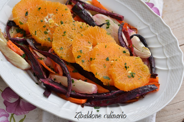 Togliere la teglia dal forno e trasferire tutto su un piatto di portata, posizionare le fette di arancia fresche e condire il tutto con la salsa di limone, dopo aver cosparso il piatto di erbe miste tritate.