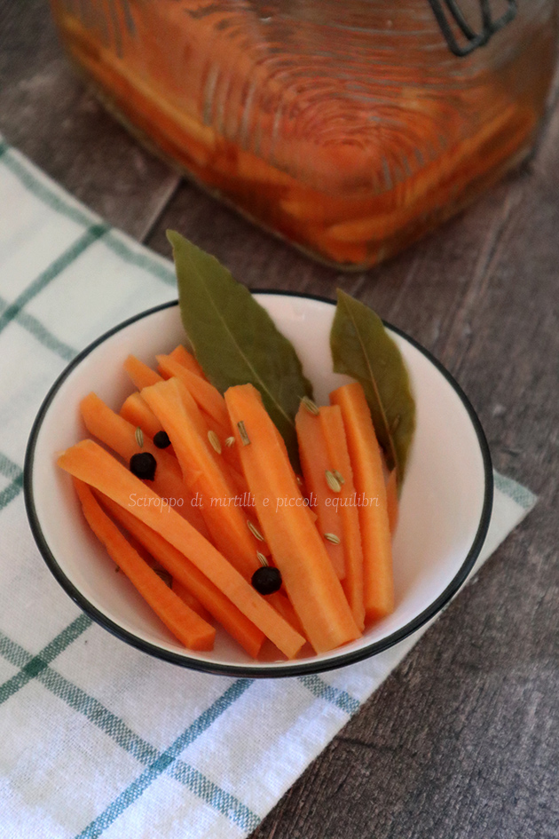Nel frattempo si tagliano le carote e bastoncini, si mettono in barattolo. Si versa il liquido aromatico sulle carote crude e si lascia raffreddare a temperatura ambiente. Si chiude e si mette in frigo, almeno per un’ora, meglio tutta la notte, prima di consumarle.