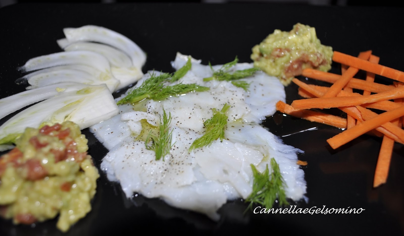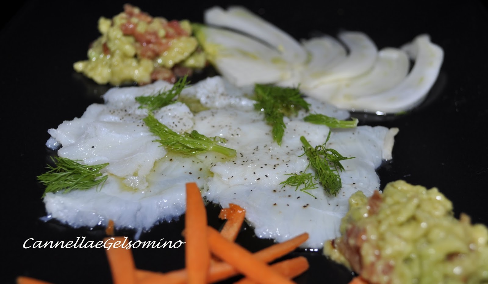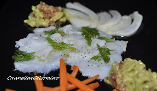 Sgocciolate il baccalà dalla marinata, sistematelo in un piatto e aromatizzatelo con ciuffetti di finocchietto e qualche fettina di aglio. Completate con pepe e un filo d’olio. Per completare il piatto ho utilizzato salsa guacamole (vedi ricetta), fettine di finocchio e carote a bastoncini.