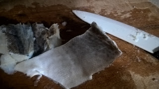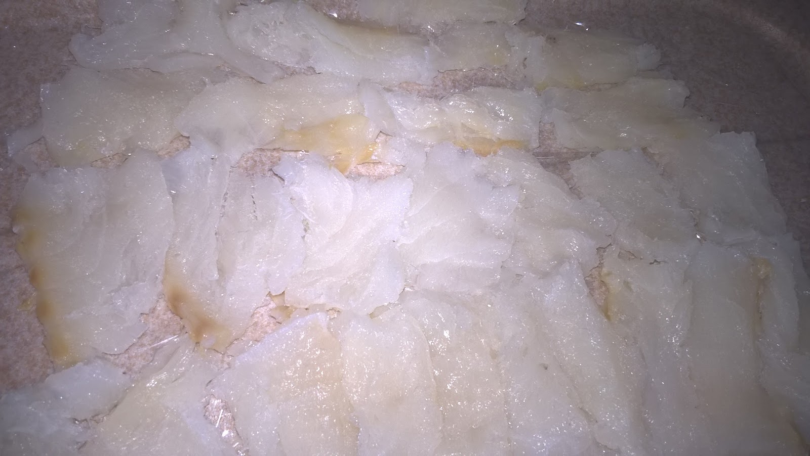Dopo aver dissalato il baccalà tenendolo in ammollo in acqua fredda (che va cambiata spesso), per almeno due giorni, togliete la pelle e tagliatelo trasversalmente in fettine sottilissime. Se non dovessero riuscirvi molto sottili, potete metterle tra due fogli di pellicola e batterle leggermente.