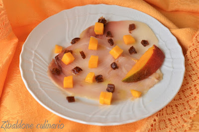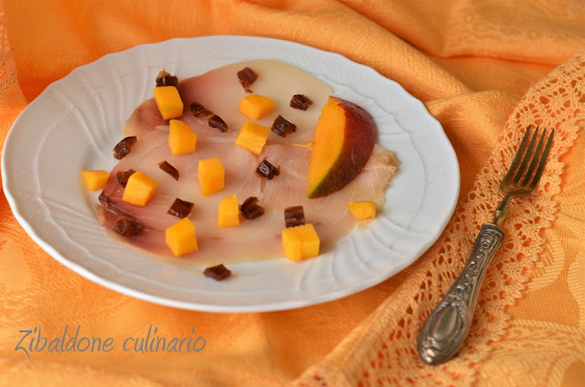 Ed ecco l’inizio del mio menù che, ve lo anticipo già, sarò a base di pesce, proprio come questo antipasto abase di pesce spada affumicato condito con un filo di olio a crudo ecosparso di mango fresco e qualche dadino di dattero. Buon appetito!!!