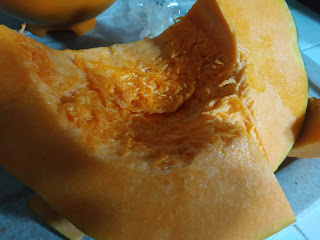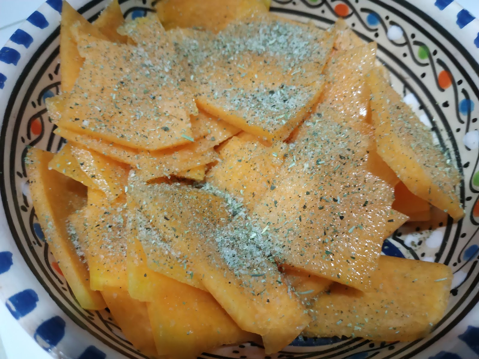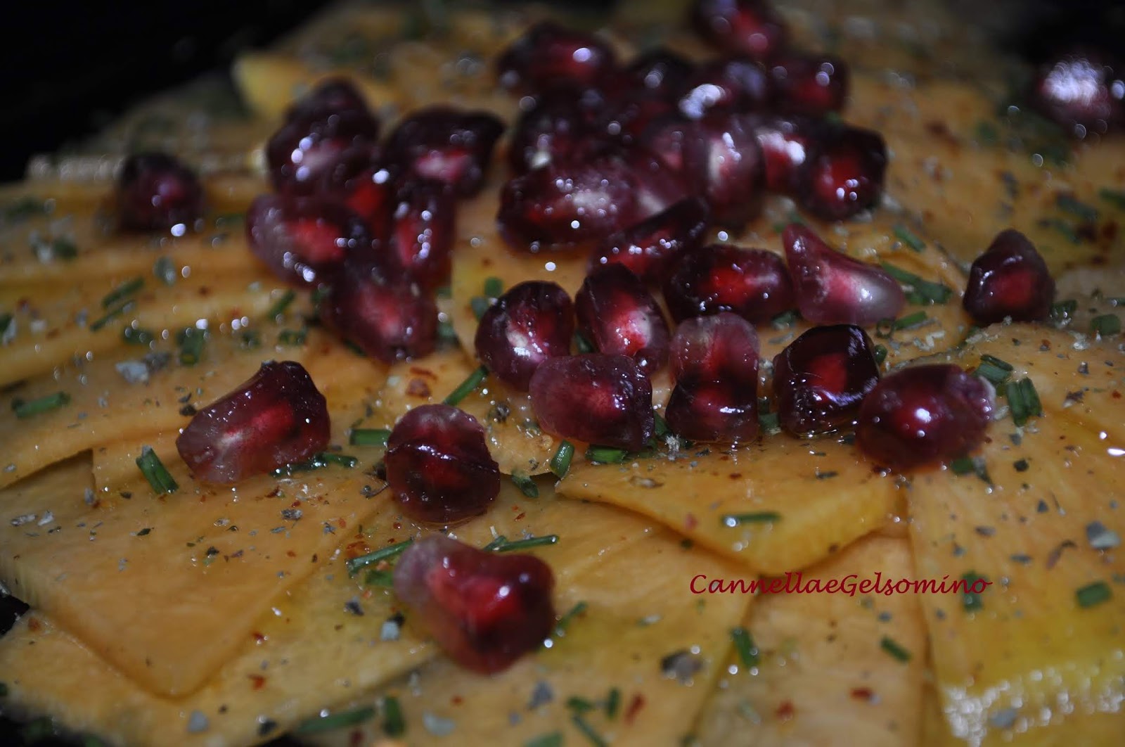 Ingredienti: zucca gialla bella soda (quantità in base ai commensali o al vostro appetito), olio extravergine d’oliva, aceto bianco, erba cipollina, erbette aromatiche, sale aromatizzato, pepe nero, peperoncino, chicchi di melagrana.