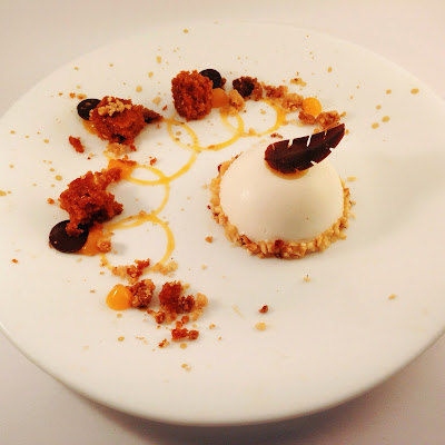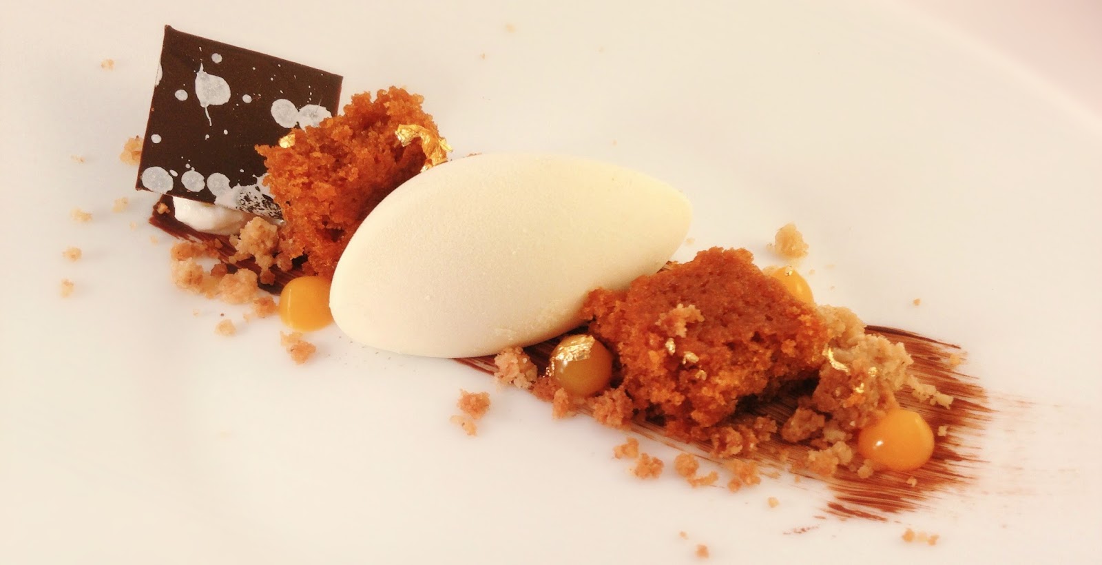 Adagiatevi sopra due cubetti di plumcake alle carote, una quenelle di vellutata al mascarpone e qualche granello di crumble. Aggiungete qualche goccia di gel fluido ACE e terminate il tutto con un quadratino di cioccolato e dell’oro alimentare in fogli.