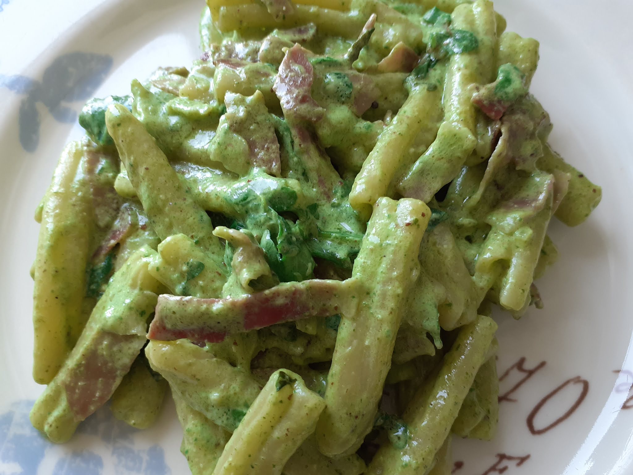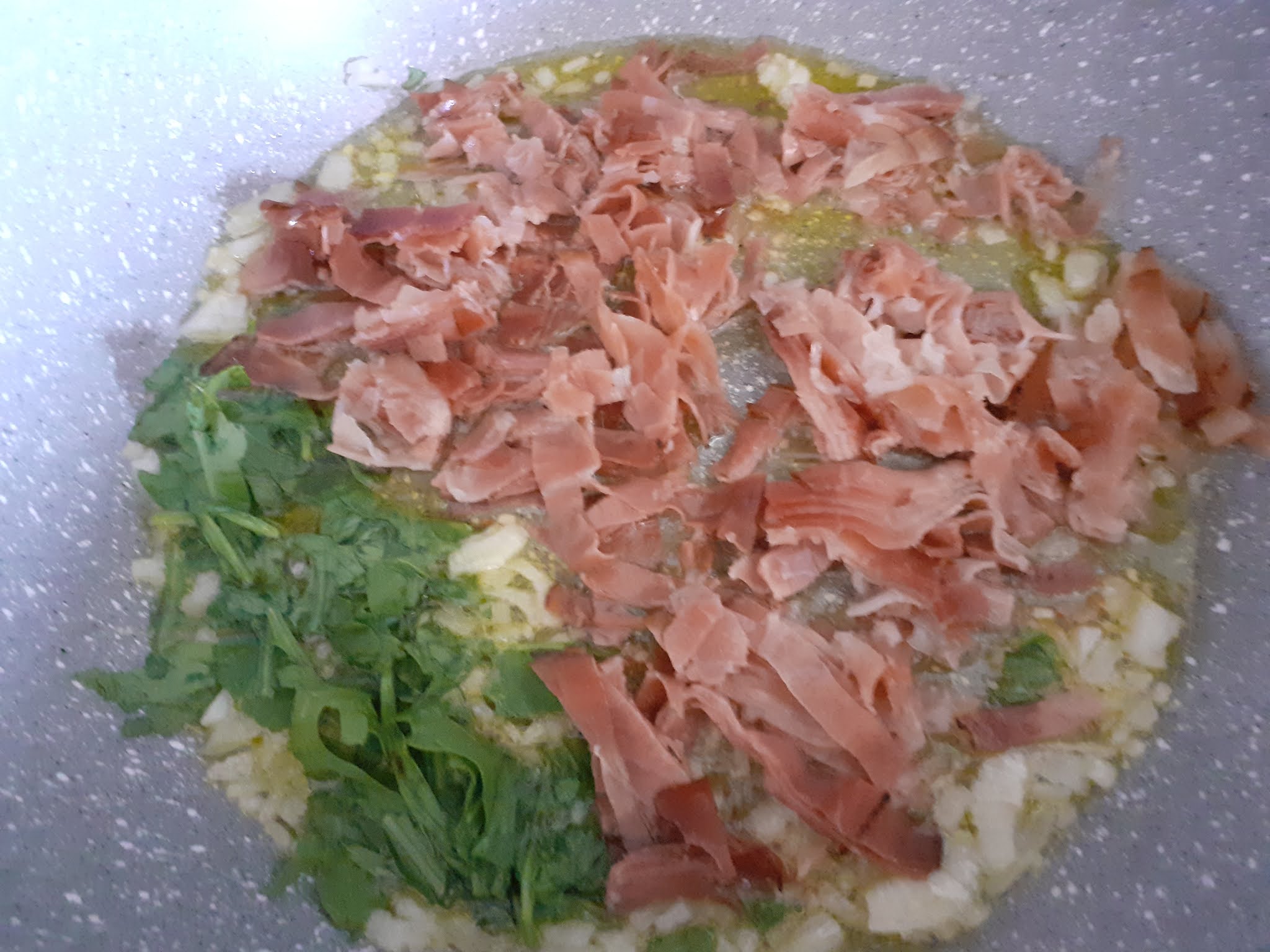 In una casseruola,olio,cipolla,speck e un pugnetto di rucola ,lasciamo appassire e tiriamo via tutto, lasciando in padella solo una parte di speck, frulliamo quanto tolto insieme ai pinoli e alla panna.e versiamo di nuovo nella casseruola.Intanto cuociamo la pasta,scoliamo al dente e grondante d’acqua la versiamo in padella,uniamo restante rucola,il peperoncino,formaggio,mantechiamo a fiamma viva e serviamo!!