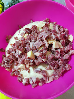 pronti a mettere le mani in pasta insieme allo Chef napoletano Roberto Di Pinto per preparare una delle prelibatezze partenopee per eccellenza? Il casatiello napoletano! Simile come impasto a quello del pane ma insaporito dal ripieno di salame tipo Napoli e Pecorino, oltre ad una generosa spolverata di pepe, il casatiello napoletano è una preparazione rustica protagonista del menu di Pasqua. La caratteristica inconfondibile? Le uova fresche ingabbiate nell’impasto a ciambella e che i bambini solitamente si litigano tavola il giorno di Pasqua! Naturalmente ogni famiglia ha la sua tradizione, soprattutto rispetto al ripieno… l’importante comunque è essere generosi e abbondare in formaggi e salumi! Armatevi degli strumenti necessari per preparare un saporitissimo casatiello napoletano, iniziando dai più importanti: mani e…amore! iniziando dai più importanti: mani e…amore! Casatiello dolce alla frutta Ingredienti per l’impasto (per uno stampo a ciambella di 24 cm di diametro) Acqua 375 g Farina 00 650 g Lievito di birra fresco 10 g Sale fino 15 g Pepe nero q.b.Casatiello napoletano LievitatiPane 4,3/5 Roberto Di Pinto Roberto Di Pinto è uno chef vulcanico e sempre alla ricerca di nuovi stimoli. La sua carriera è iniziata a Napoli nella storica… CONTINUA 400 Difficoltà: elevata Preparazione: 40 min Cottura: 75 min Dosi per: 8 persone Costo: medio NOTA: + 1 ora e mezza di lievitazione Presentazione Casatiello napoletano Pronti a mettere le mani in pasta insieme allo Chef napoletano Roberto Di Pinto per preparare una delle prelibatezze partenopee per eccellenza? Il casatiello napoletano! Simile come impasto a quello del pane ma insaporito dal ripieno di salame tipo Napoli e Pecorino, oltre ad una generosa spolverata di pepe, il casatiello napoletano è una preparazione rustica protagonista del menu di Pasqua. La caratteristica inconfondibile? Le uova fresche ingabbiate nell’impasto a ciambella e che i bambini solitamente si litigano tavola il giorno di Pasqua! Naturalmente ogni famiglia ha la sua tradizione, soprattutto rispetto al ripieno… l’importante comunque è essere generosi e abbondare in formaggi e salumi! Armatevi degli strumenti necessari per preparare un saporitissimo casatiello napoletano, iniziando dai più importanti: mani e…amore! Casatiello dolce alla frutta Ingredienti per l’impasto (per uno stampo a ciambella di 24 cm di diametro) Acqua 375 g Farina 00 650 g Lievito di birra fresco 10 g Sale fino 15 g Pepe nero q.b. Strutto 25 g Olio extravergine d’oliva 25 g PER IL RIPIENO Salame napoletano 150 g Pecorino 150 g PER DECORARE Uova 4 Per preparare il casatiello napoletano, iniziate versando il lievito di birra fresco in acqua a temperatura ambiente (1), mescolate per scioglierlo (2), quindi versate la miscela nella tazza di una planetaria dotata di gancio (3). Casatiello napoletano Unite anche gli altri grassi: l’olio e lo strutto (4). Iniziate a lavorare a velocità bassa gli ingredienti e poco per volta aggiungete metà della dose di farina, aiutandovi con un cucchiaio (5). Una volta che la farina sarà assorbita e avrete ottenuto una sorta di pastella, unite il sale (6). Casatiello napoletano A questo punto unite la farina rimasta in una sola volta (7) e continuate a lavorare a velocità media. L’impasto dovrà avere una consistenza morbida, ma non eccessivamente. Ci vorranno circa 10 minuti di lavorazione con la planetaria (8). Altrimenti potete lavorare con la planetaria per 5 minuti e i restanti 5 a mano sul piano di lavoro. Una volta terminata la lavorazione, arrestate la planetaria e trasferite l’impasto sul piano di lavoro (9) giusto il tempo di dare una forma sferica; lasciatelo riposare sul piano di lavoro mentre preparate il ripieno, non ci sarà bisogno di coprirlo. Casatiello napoletano Togliete la pelle al salame e tagliatelo a fette non troppo sottili nel senso della lunghezza (10), poi riducetelo a striscioline e infine a cubetti (11). Con un coltello eliminate la crosta dal Pecorino (12) Casatiello napoletano e realizzate dei cubetti sempre piuttosto grossi come quelli del salame (13): in questo modo salame e formaggio si avvertiranno nel ripieno. Riprendete l’impasto, prelevatene un pezzetto (circa 80 grammi) (14) e tenetelo da parte: vi servirà per sigillare le uova sul casatiello successivamente. Appiattite leggermente l’impasto (15) Casatiello napoletano versate i cubetti di Pecorino e salame sull’impasto (16), e lavoratelo con le mani fino a quando tutti gli ingredienti saranno incorporati (17-18). Casatiello napoletano Spolverizzate il tutto con abbondante pepe nero (meglio se macinato al momento) (19) ed impastate in modo da farlo assorbire (20). Maneggiate l’impasto per estenderlo a filoncino (21) Casatiello napoletano E quando sarà sufficientemente lungo (22), prendete uno stampo a ciambella di 24 cm di diametro e imburratelo; posizionate il filoncino realizzato all’interno dello stampo (23) unendo e sigillando le due estremità (24). Casatiello napoletano Ora ponete in maniera verticale le uova crude in 4 punti ben distanziati del casatiello facendo una leggera pressione (25); quindi riprendete l’impasto messo da parte e lavorate 8 pezzetti per formare dei filoncini (26), che potrete posizionare a croce sulle uova per ingabbiarle (27). Casatiello napoletano Una volta terminato coprite il casatiello con un canovaccio pulito (28) e lasciatelo lievitare a temperatura ambiente lontano da correnti d’aria per circa 1 ora, 1 ora e mezza. Una volta che il volume sarà quasi raddoppiato (29) cuocete il vostro casatiello napoletano in forno statico preriscaldato a 170° per 75 minuti, nel ripiano più basso del forno. Una volta cotto (30), lasciatelo intiepidire, quindi sformatelo delicatamente e ponetelo su un piatto da portata. Il vostro casatiello napoletano è pronto per essere condiviso con tutta la famiglia! Conservazione Il casatiello si può conservare ben coperto per 3-4 giorni a temperatura ambien