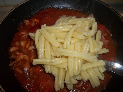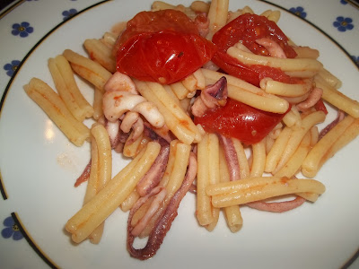 Scolatela al dente e mescolatela al condimento di pesce, se il sughetto si è leggermente asciugato, aggiungete un mestolo di acqua di cottura della pasta.