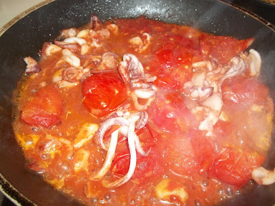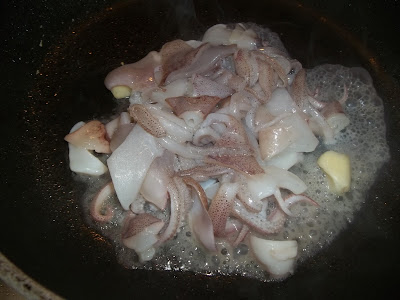 In una padella fate soffriggere l’aglio che eliminerete quando sarà dorato, aggiungete i calamari e fate rosolare per alcuni minuti.