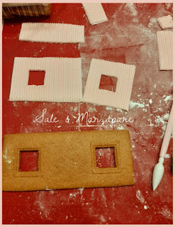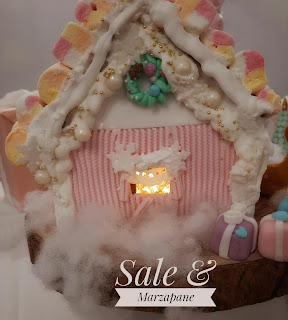 Ho realizzato i vari dettagli come il portone (colorando un po di pdz con colorante marrone), le ghirlande e i merletti alle finestre (ho utilizzato dei centrini di carta ed incollati con il miele). Ho lasciato asciugare qualche minuto.