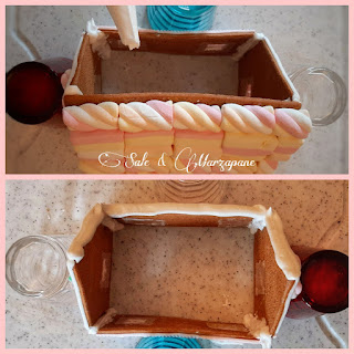 Nel frattempo ho composto le due parti del tetto incollando con poco miele le caramelle marshmallow tra loro.