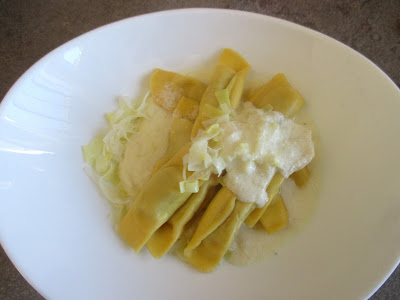 Prepare the sauce Mornay. Reheat the sauce and add the two cheeses with butter. Stir until a smooth sauce. United now the leeks and stir well. In a pot of boiling hot water cook casoncelli. When they are ready, put them in a bowl and toss with the sauce. Mix well and serve hot