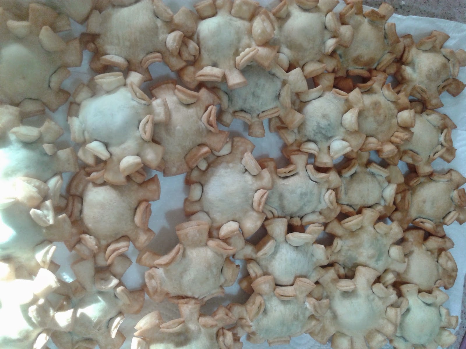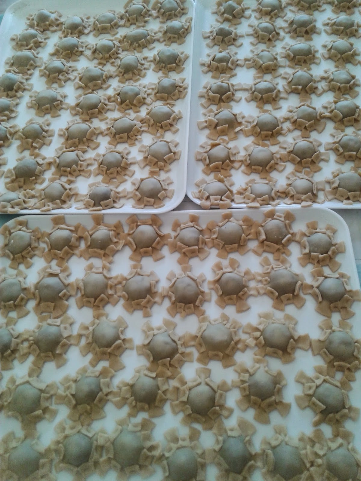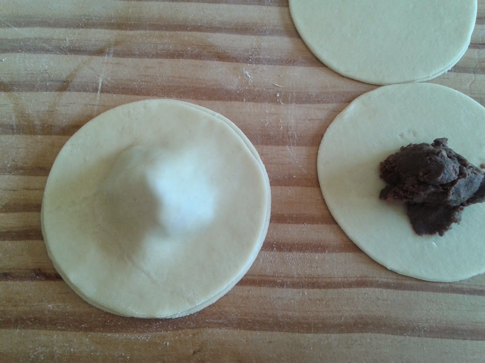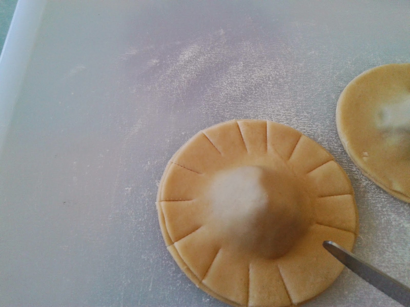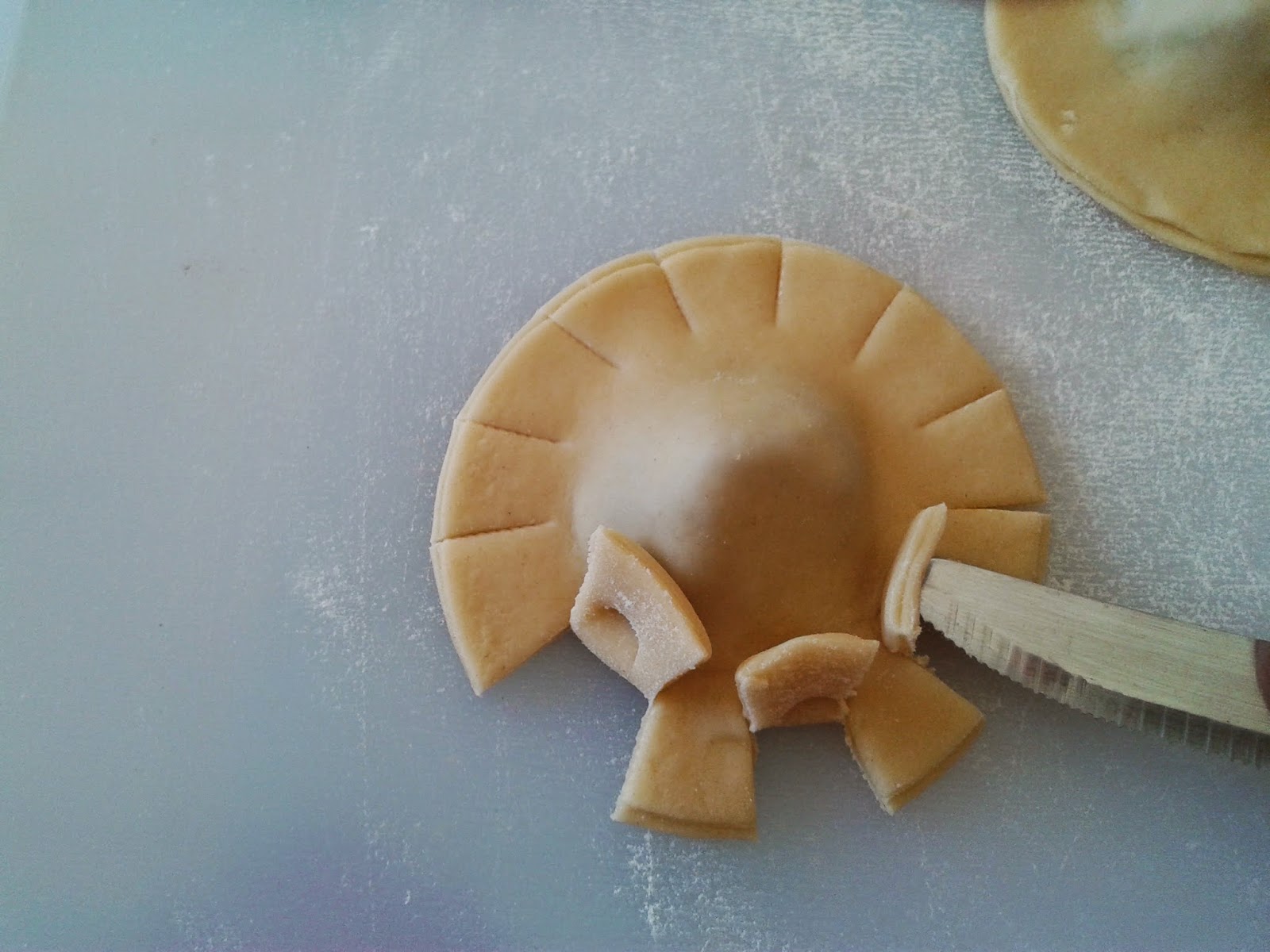 Versate la farina sulla spianatoia o nella ciotola della planetaria, unite tutti gli ingredienti ed impastare fino ad ottenere un impasto omogeneo. Copritelo con pellicola da cucina e lasciatelo riposare per un’ oretta. Io lo preparo la sera prima e lo conservo in frigo in un contenitore ermetico. Tagliate un pezzettino di pasta per volta e ripassatelo nella macchinetta Nonna Papera per ottenere la sfoglia che deve essere sottile almeno 3 millimetri (io mi fermo al n.5 del livello) . Ricavate tanti dischi di circa 8 cm di diametro utilizzando un bicchiere o una tazza. Farcite ogni disco con un cucchiaino di ripieno e ricoprite con un altro disco (se i bordi non si sigillano bagnateli con un poco d’acqua utilizzando un pennellino. Fate uscire bene l’aria dal saccottino e, con l’aiuto di un coltello ricavate 11/13 tagli intorno al castagnaccio facendo attenzione a non intaccare il ripieno.