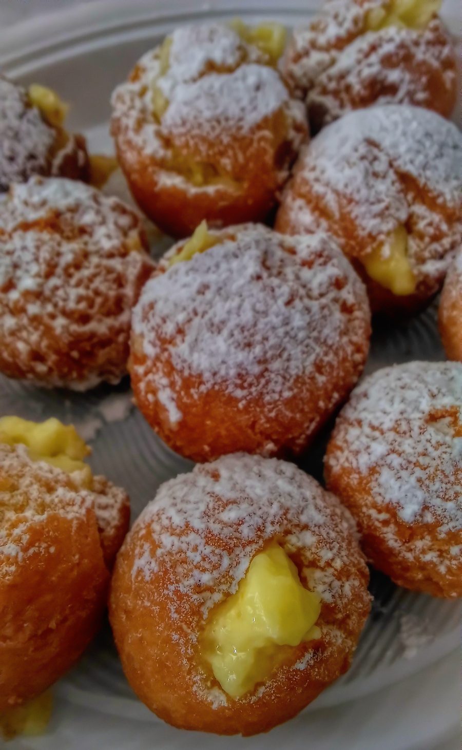 Adesso mettete la crema in una sac a poche con la punta da riempimento e riempite le castagnole. Una volta piene fatele rotolare nello zucchero a velo.