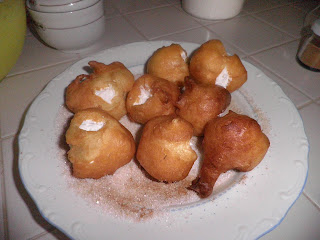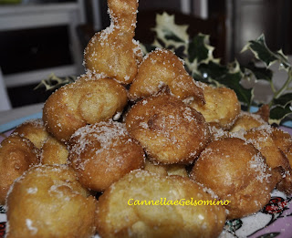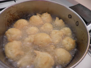 L’impasto delle castagnole è quello della pasta choux: in un pentolino mettete 250 ml di acqua, 50 g di burro, 1 cucchiaino di zucchero e un pizzico di sale. Portate il tutto ad ebollizione e versate in un sol colpo 150 g di farina 00. Mescolate energicamente fino a quando si formerà una palla che si stacca dal fondo. Togliete dal fuoco e fate intiepidire. ( Questi passaggi non li ho potuto documentare perchè ho solo due mani!). Aggiungete quindi 4 uova, ma uno alla volta perchè il loro assorbimento richiede un po’ di olio di gomito.