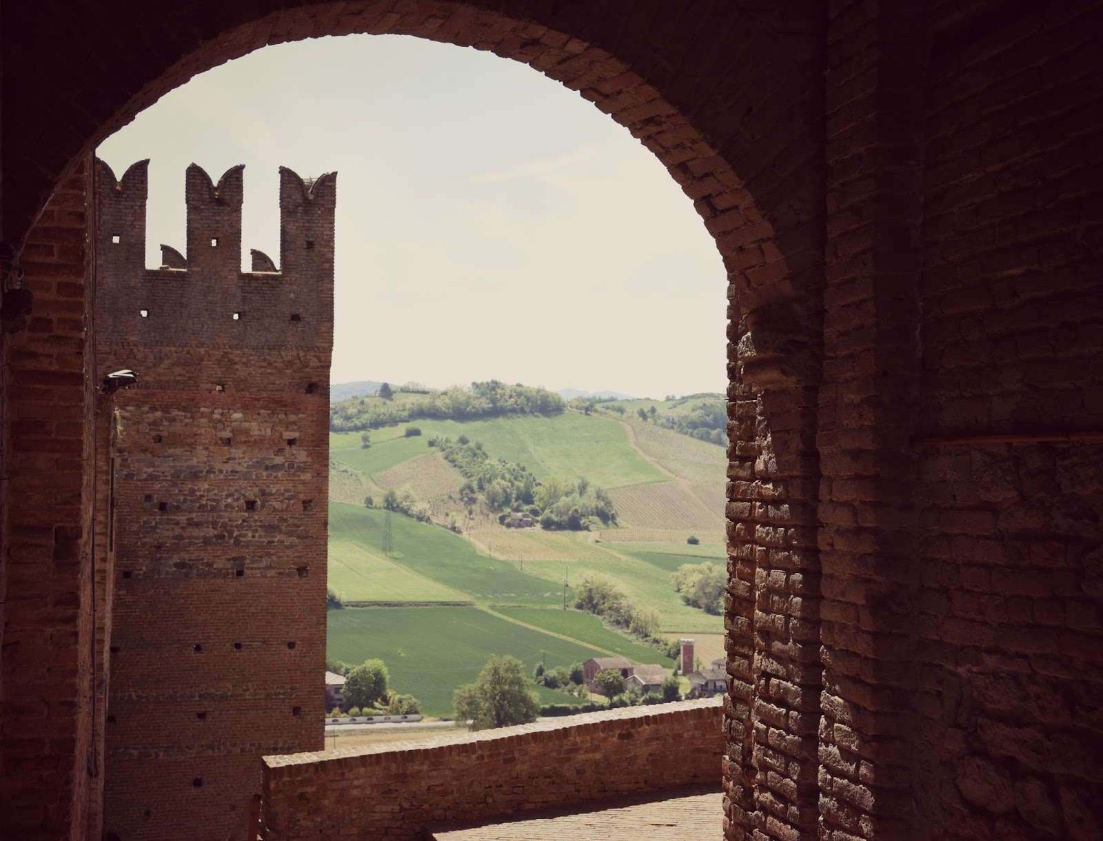 Camminiamo sul ponte levatoio della Rocca Viscontea, passiamo sotto l’arco del portone principale dal quale si apre subito un bellissimo scorcio sulle colline intorno a Castell’Arquato e Giulia comincia ad urlare “Ma è un disegno?”. Io non capisco cosa voglia dire e lei ripete insistentemente la stessa domanda. “Giulia, cosa? Quale disegno?” e lei punta impazientemente con l’indice destro le stesse colline che stavo cercando di inquadrare con la macchina fotografica. Alla fine scopriamo che quel disegno è il paesaggio circostante. Una meraviglia.