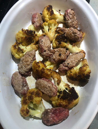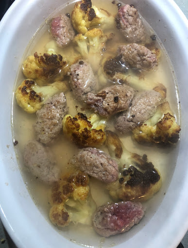 Salate e pepate la carne e fate delle palline che assomigliano a un american football, e metteteli su una teglia da forno, poi aggiungete i cavolfiori cotti, e acqua