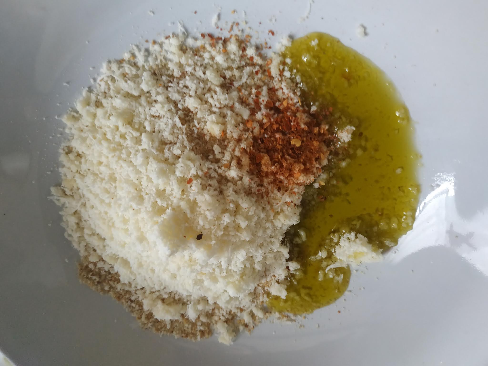 Mescolate il formaggio e il pangrattato al 50% ( quantità indicative, non ne do’ di precise perchè dipende dalla quantità che dovete preparare); aggiungete olio extravergine d’oliva in modo che il pangrattato si bagni bene; aggiungere sale, peperoncino e se vi piace anche la paprika dolce.