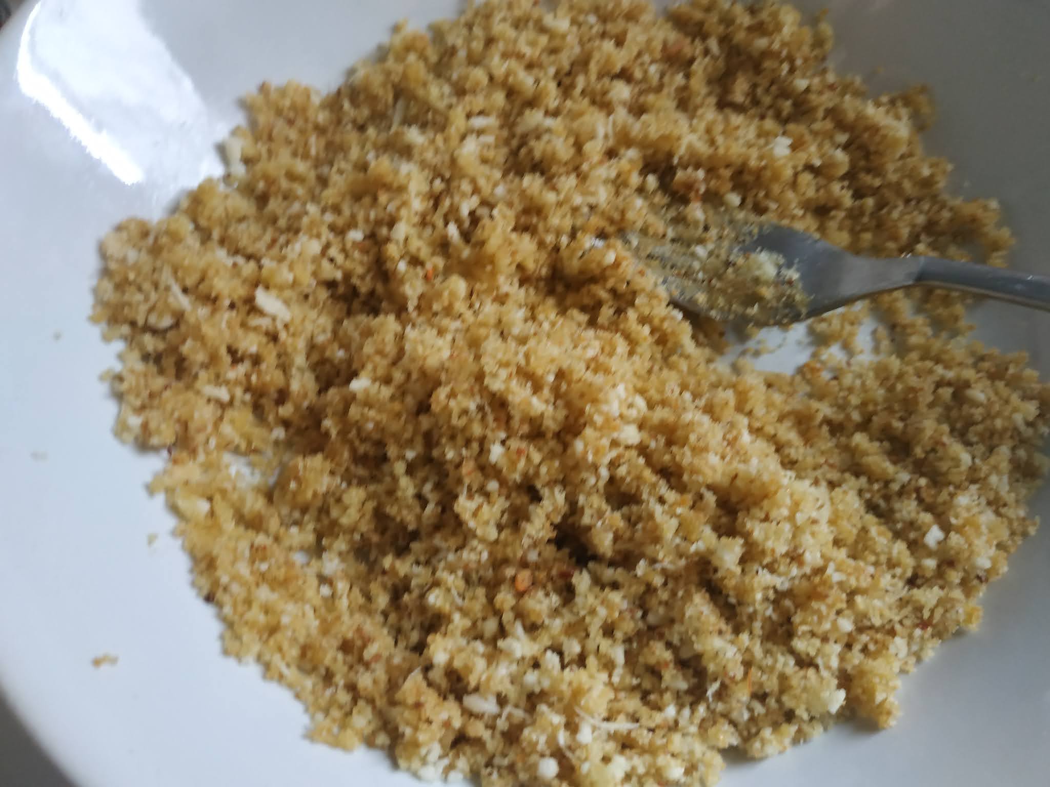 Ingredienti: cavolfiore sbollentato e tagliato a cimette; pangrattato, parmigiano o caciocavallo grattugiato, olio extravergine d’oliva, peperoncino, sale.