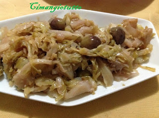 Tagliare a listarelle sottili il cavolo e farlo saltare, per cinque minuti, a fiamma viva in un tegame con un filo d’olio. Abbassare la fiamma, salare e unire il peperoncino spezzettato, mettere il coperchio e farlo stufare per 20 minuti. Togliere il coperchio, aumentare la fiamma, unire le olive, versare l’aceto, far sfumare e servire.