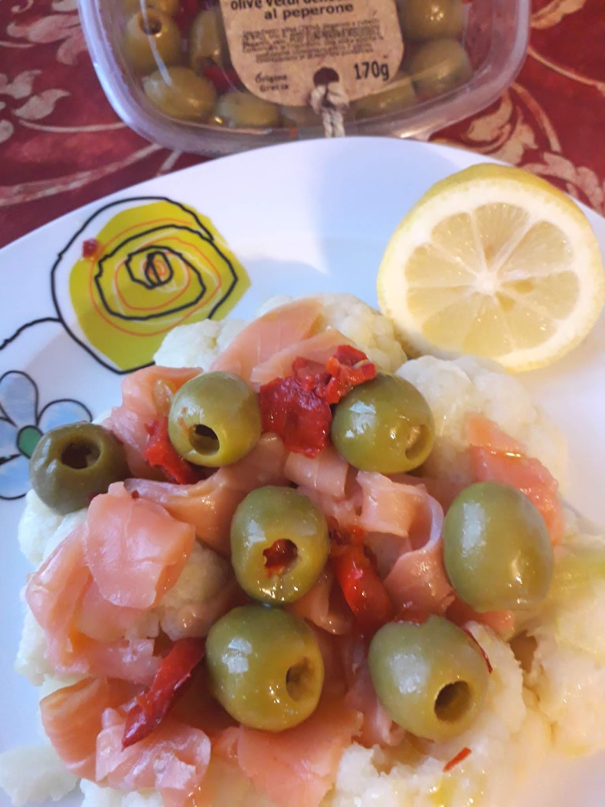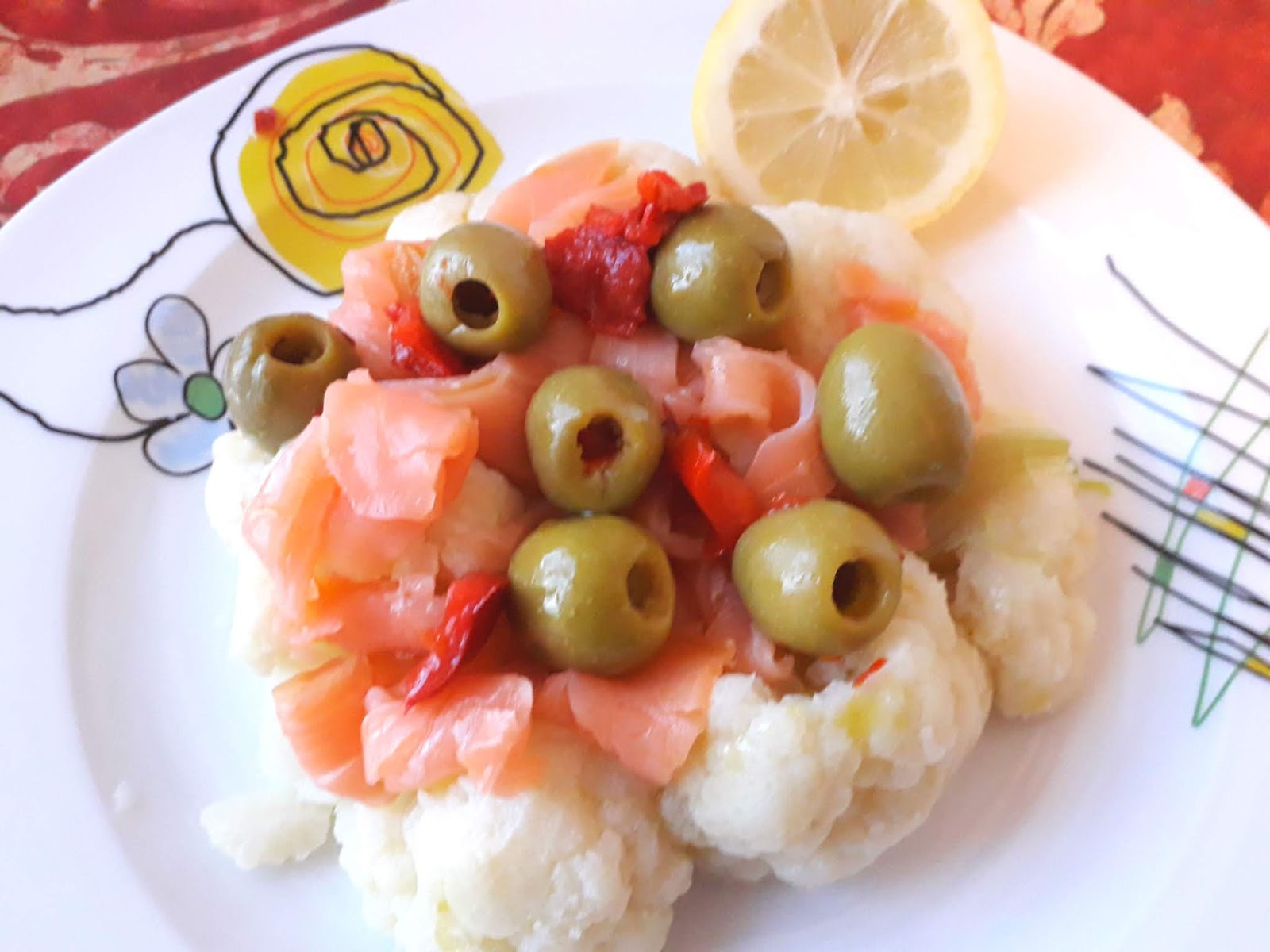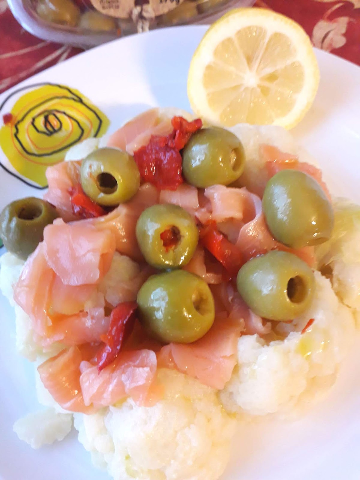 impiattare ,cavolo,salmone,olive,un filo di olio e una spremuta di limone!!