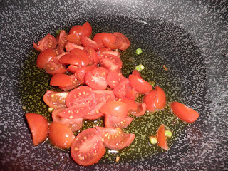 Fate rosolare con olio extravergine di oliva e uno spicchio d’aglio tritato dei pomodorini ciliegini.