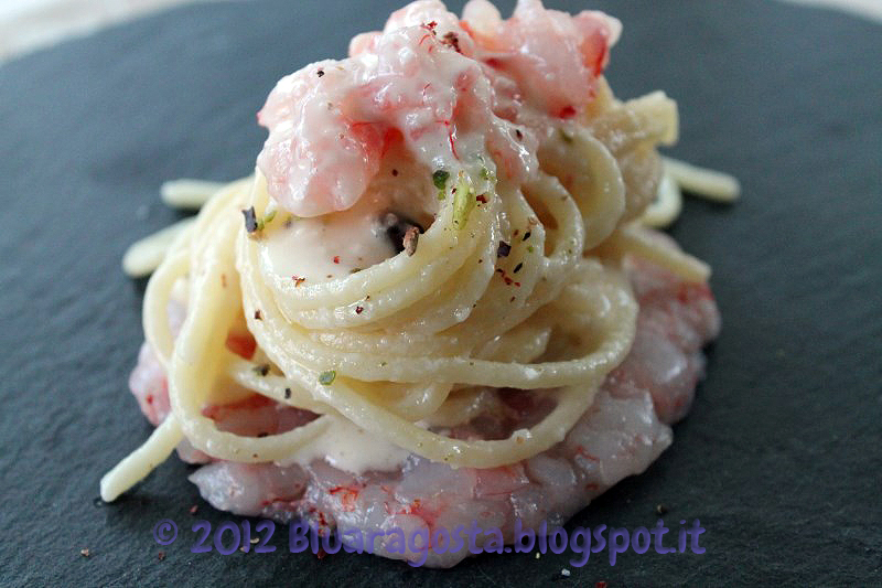 Spaghetti al beurre blanc di prosecco con tartare di gamberi rossi di Mazara pepe rosa granella di pistacchi