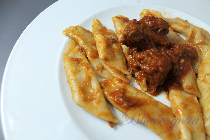Sembra un ragù alla napoletana ma molto speziato. Cosa sono i fusi? Pasta che ricorda come forma le penne ma fatta rigorosamente a mano, e gettonatissima fra Trieste e l’istria! Ma non è la solita pasta all’uovo, perché ha qualcosa di particolare nell’impasto, e accidenti se è buona! Ricetta vista e presa all’istante, ed ecco i miei fusi di Pola. Conditi col sugo del gulasch, la carne mi è poi servita come secondo.