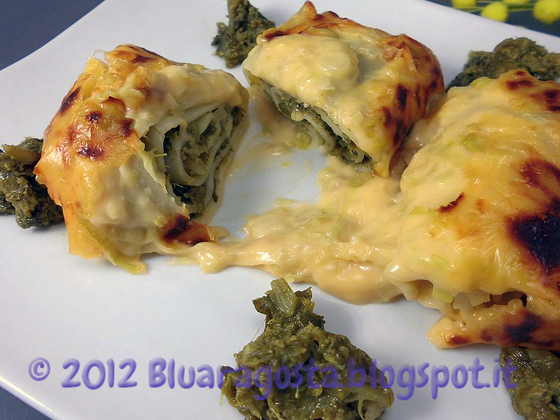 Roll di lasagne ricce e cime di rapa con salsa di porri e cheddar