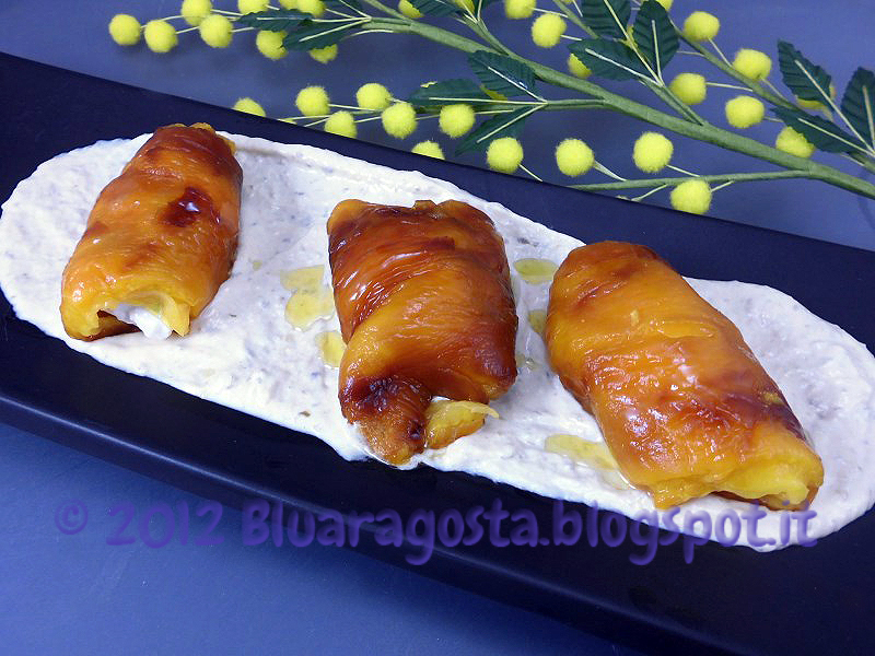 Rotolini di peperoni gialli ripieni di burrata con salsa tonnata