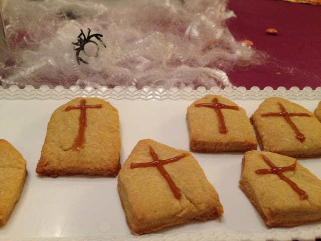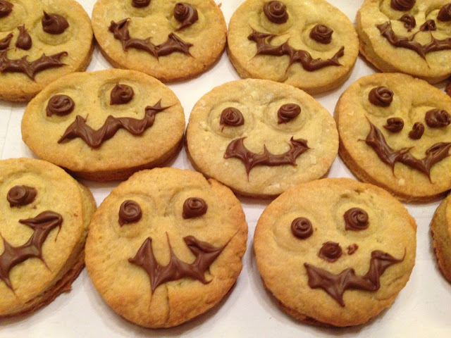 Preriscaldare il forno a 180 gradi. Mettere nel boccale 250 gr di farina, 100g di zucchero, 100g di burro a pezzi, 1 uovo, 1 cucchiaino di lievito in polvere e un cucchiaino di miele impastare 20 sec. vel. 6. Prelevare un cucchiaio di impasto per volta e formare una pallina e schiacciarla a formare un cerchio per metà impasto. All’altro metà impasto dare la forma delle bare di Halloween. Infine distribuire i biscotti su una teglia rivestita di carta da forno e mettere in forno per circa 15-20 minuti. Decorate i biscotti creando le faccine delle zucche con Nutella per Halloween e con marmellata di albicocche creando una croce per le tombe di Halloween.