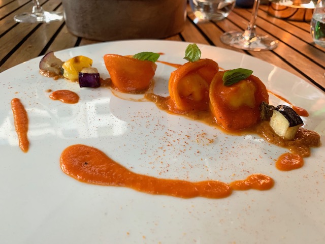 ravioli di zafferano, con ripieno di ricotta mista e salsa alla caponata di melanzane