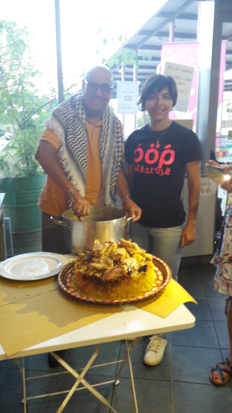 | la mia foto con un medico palestinese molto gentile che vive ad Ivrea, che gentilmente è andata a casa sua a prenderci il vassoio per rovesciare la maqlouba. |