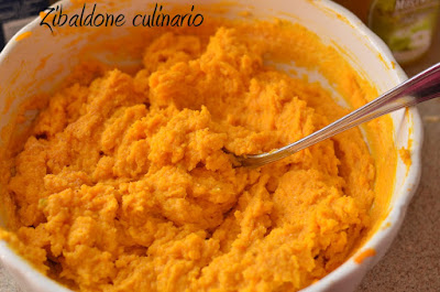 Preparare la farcia: cuocere la zucca già mondata a vapore (io con il bimby, metto nel cestello, e poi imposto varoma per 30 minuti a vel 1). Passare con lo schiaccia patate e poi far raffreddare.